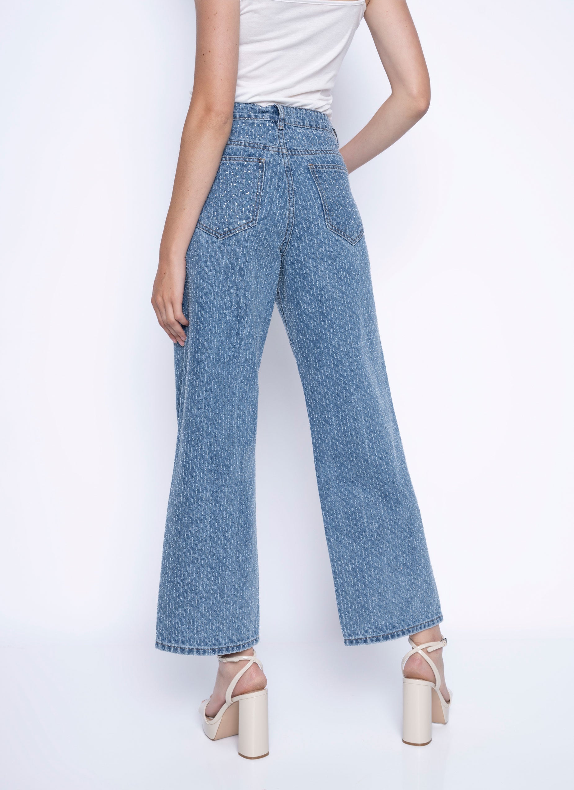 Crafted from 100% cotton, these jeans offer a breathable, structured feel that holds its shape beautifully. Also, the wide leg cut creates a flattering, modern profile that moves easily from day to night. Rhinestone detailing on both the front and back pockets adds eye-catching charm from every angle.